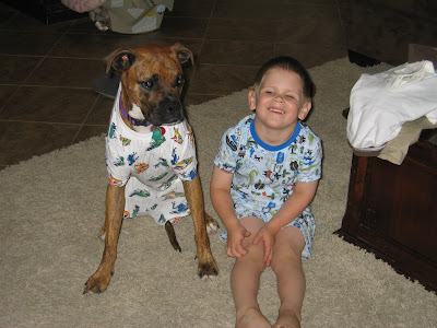 Its bedtime! Cayson's new obsession...dressing Brindle in pajamas. It is pretty funny.